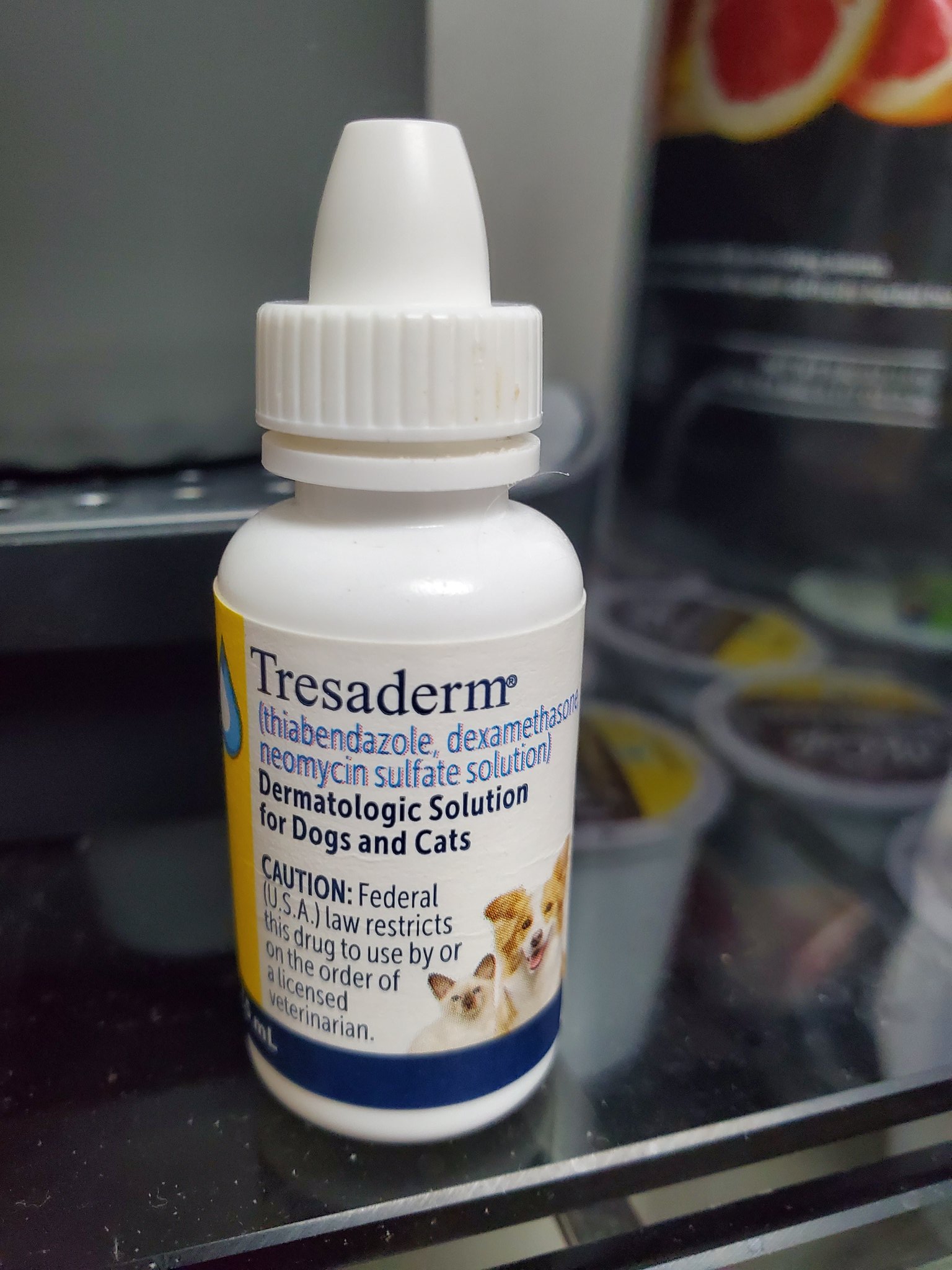 Tresaderm was prescribed for my cats ear infection and I wasnt aware that it needed to be refrigerated. How long do you use Tresaderm for cats. Neomycin sulfate dexamethasone thiabendazole.